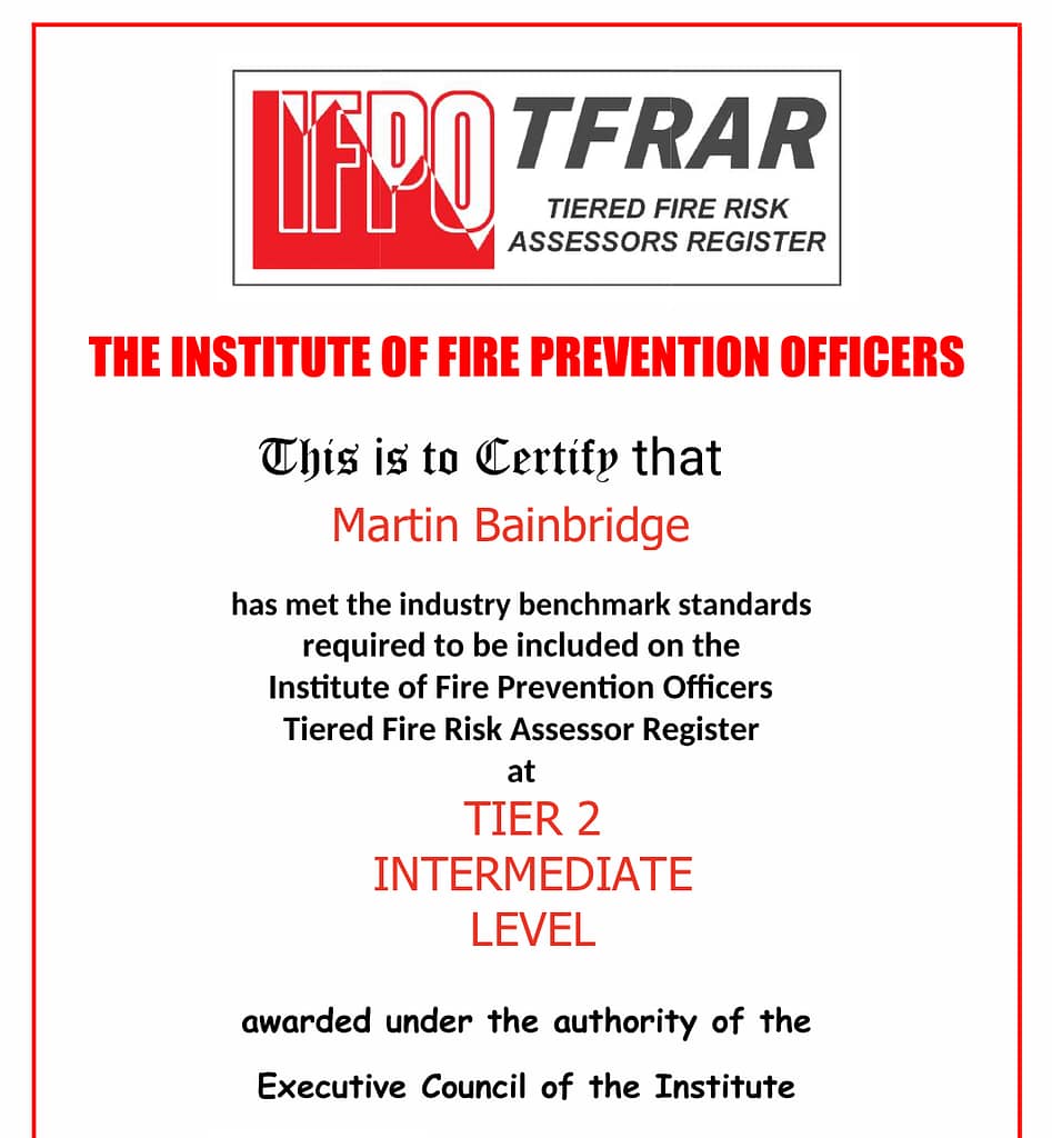 Our fire risk assessment competence is demonstrated by certification and registration with the Institute of Fire Prevention Officers Fire Risk Assessment Tiered Register.